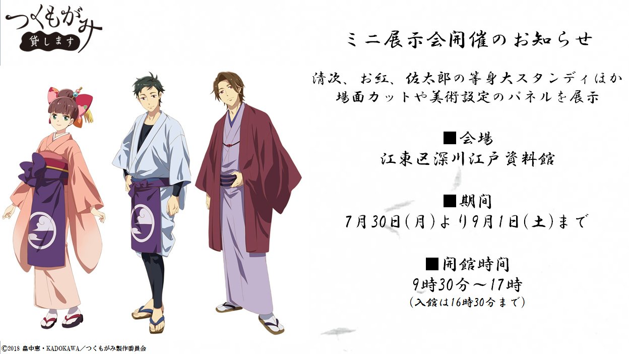 アニメ つくもがみ貸します 公式 Info 深川江戸資料館で開催中のミニ展示会も いよいよ今週1日 土 まで 本作の展示はもちろん江戸の町や文化を学べる施設ですので 夏休みの締めに 自由研究のテーマに ぜひご来館ください つくもがみ T
